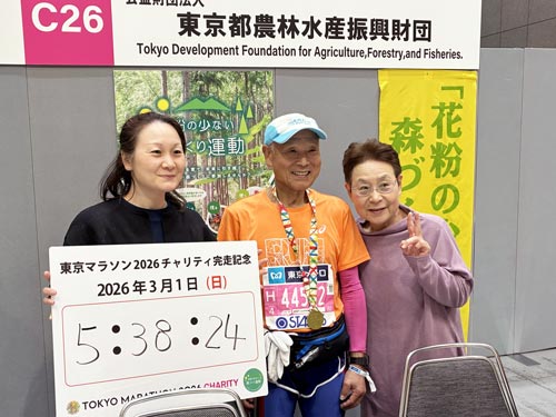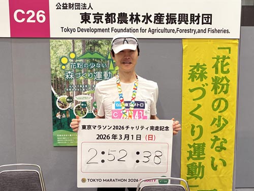 私どもは東京マラソン2026チャリティの寄付先団体として、東京国際フォーラムにてチャリティラウンジを設け、フィニッシュ後のチャリティランナーと記念撮影をして完走を称えました。出走されたランナーの皆さま、お疲れさまでした。