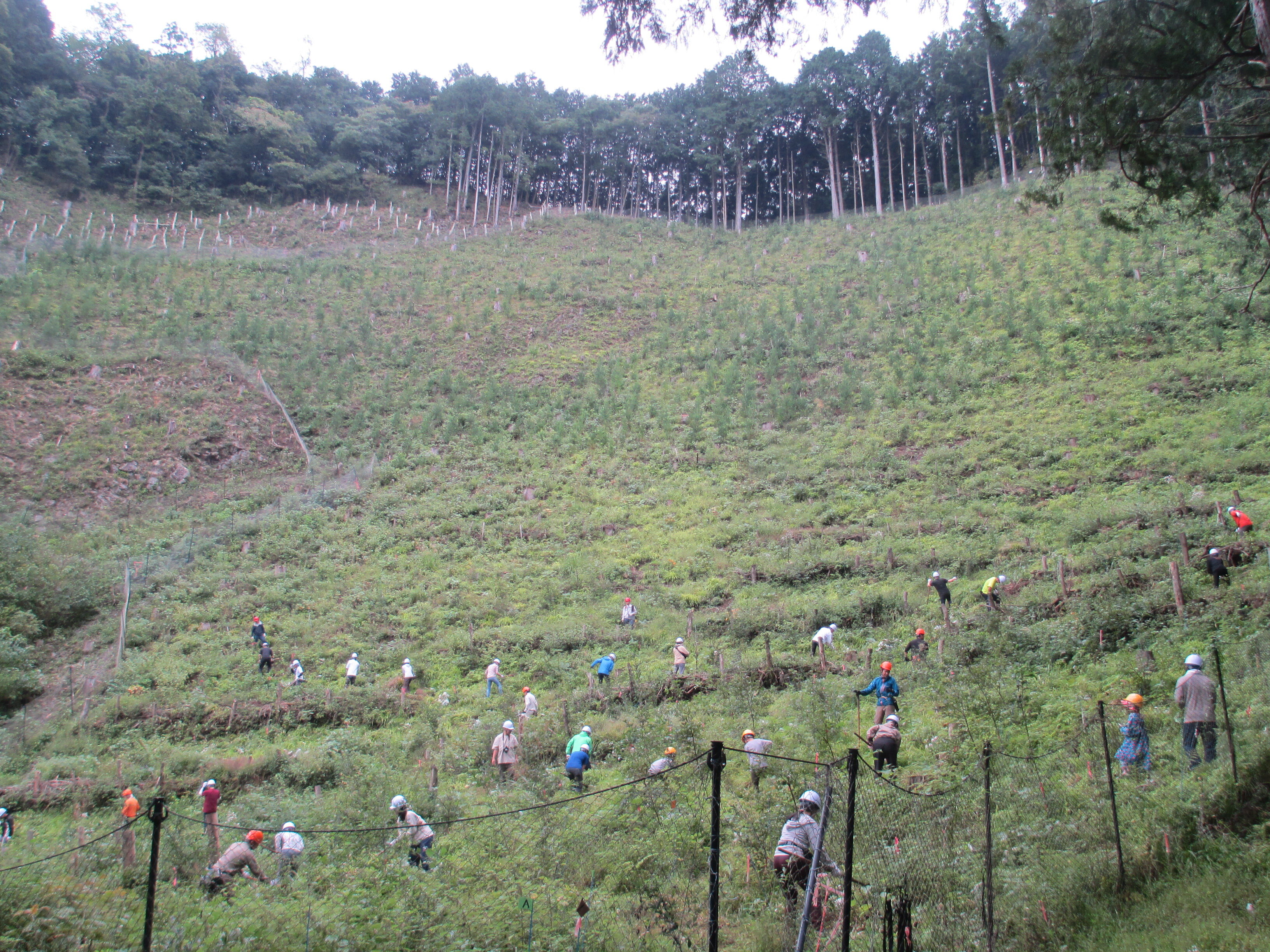 今年の作業は、苗木の成長を妨げる下草の刈り取りです。猛暑の影響で草の伸びが例年以上に激しく、斜面の下から中腹まで、大ガマを使っての作業はかなりの重労働となりました。それでも3班に分かれて協力して作業を進め、見事にすっきりとした森を取り戻すことができました。