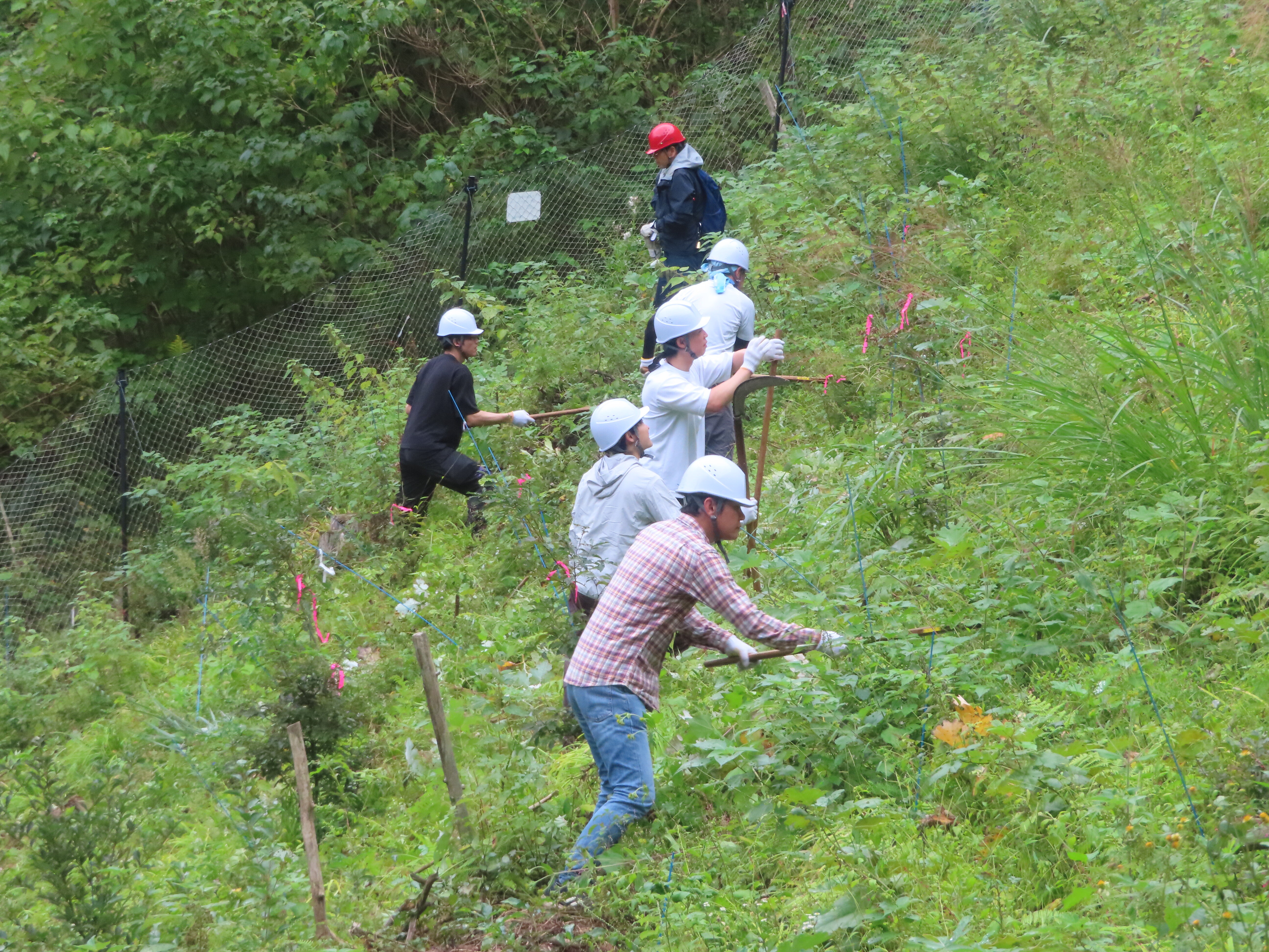 下刈り作業終了後には丸太切りの体験もあり、きびしい暑さの中、森林施業の大変さを体験し、また環境保全の大切さを考えることのできる充実した活動となったようです。
